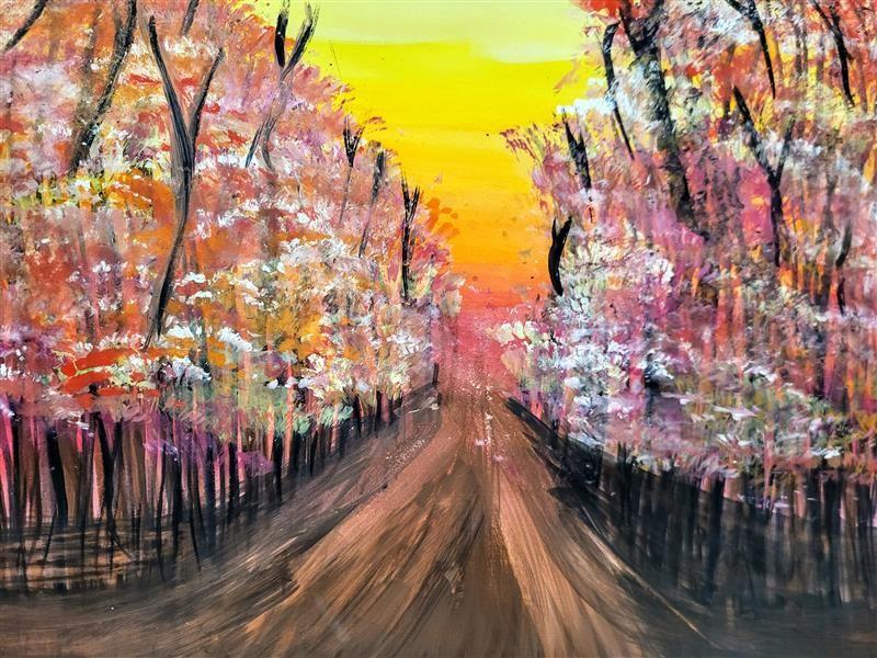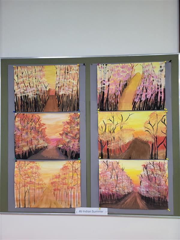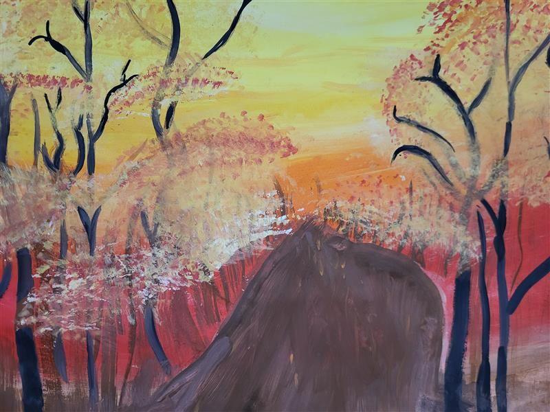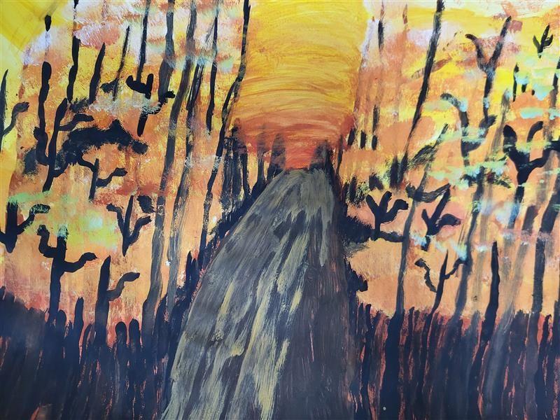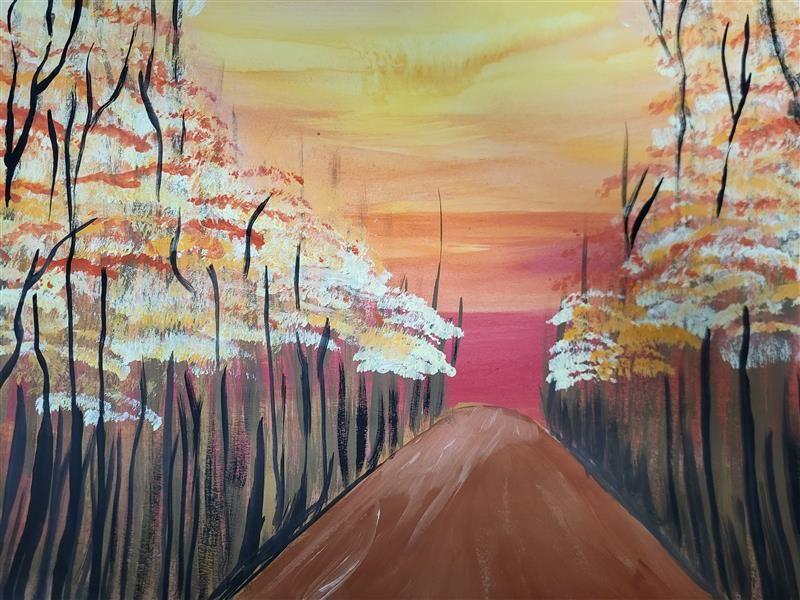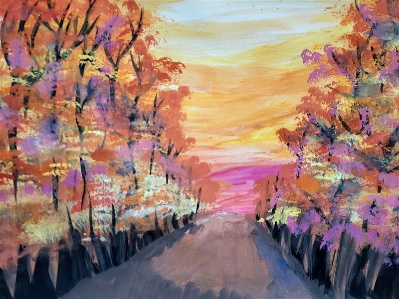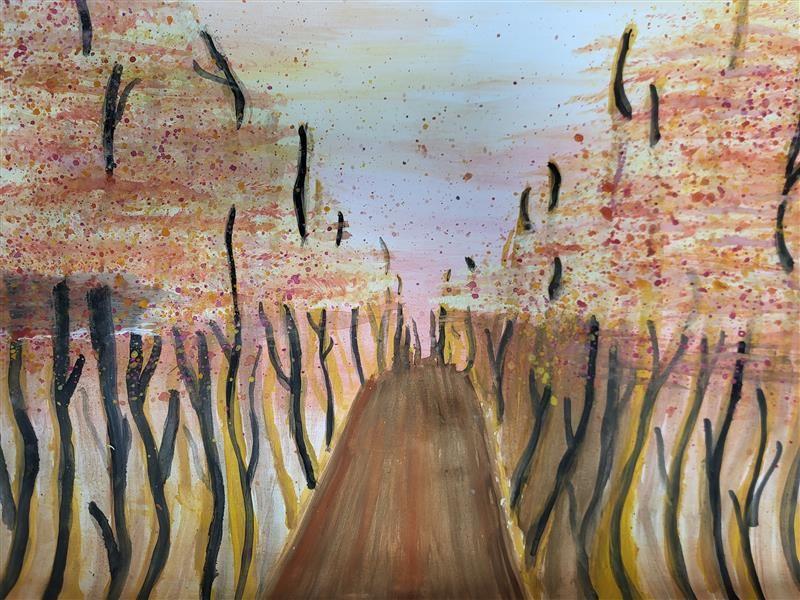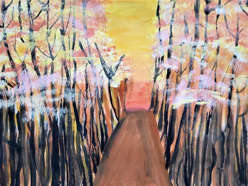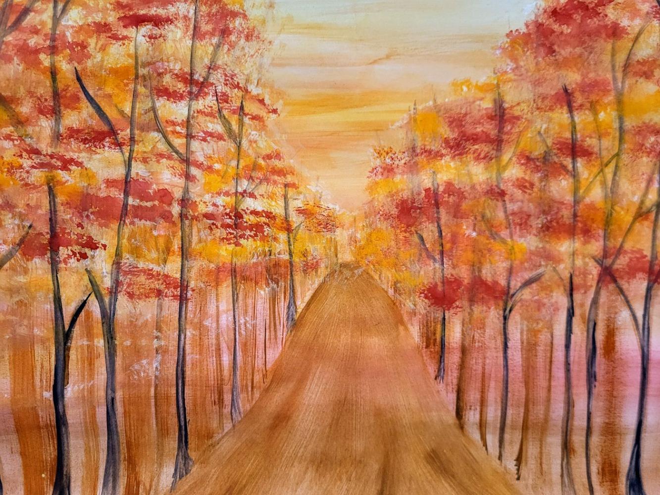 Mit leuchtenden Deckfarben entstanden stimmungsvolle spätherbstliche Landschaften, in denen warme Farbtöne, bunte Laubbäume und ein stiller Weg durch die Natur im Mittelpunkt stehen. Die Schülerinnen und Schüler setzten sich dabei mit der Wirkung von Farbe, Perspektive und Bildkomposition auseinander und brachten ihre ganz persönliche Vorstellung vom rotgoldenen Herbst aufs Papier.