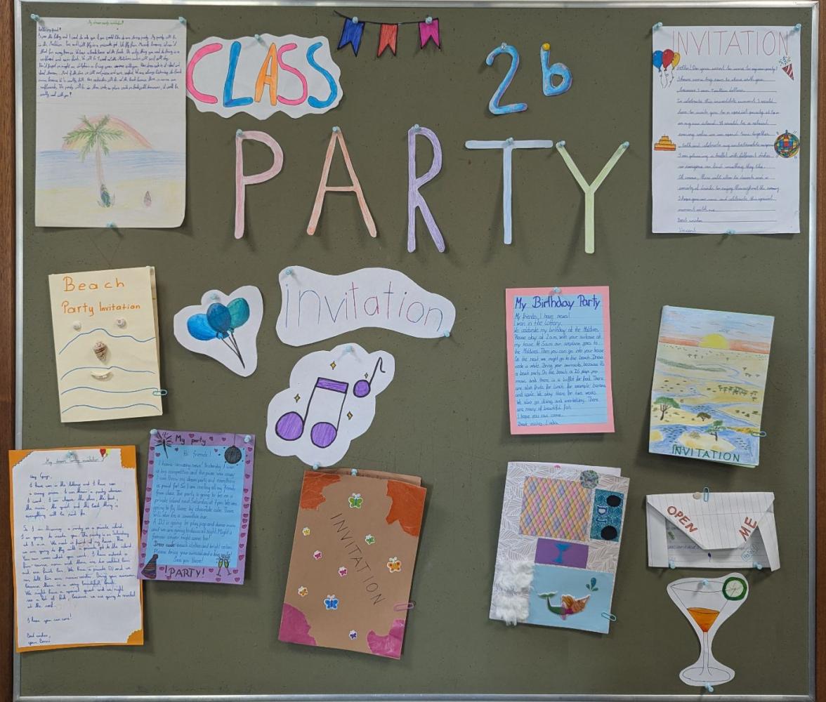 Zunächst verfassten die SchülerInnen einen ausführlichen Einladungstext, in dem sie ihre Party genau beschrieben – inklusive location, food, music und besonderen Highlights. Dabei übten sie verschiedene Zeitformen wie present simple, past simple und going-to future. Anschließend gestalteten sie passende Einladungskarten, die durch ihre Kreativität und liebevolle Ausarbeitung überzeugten.