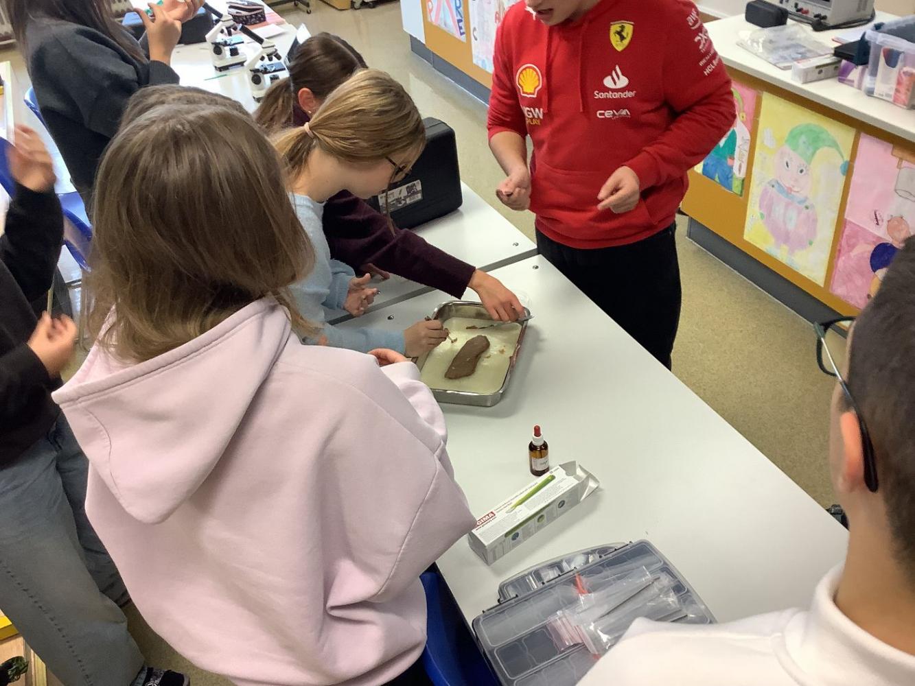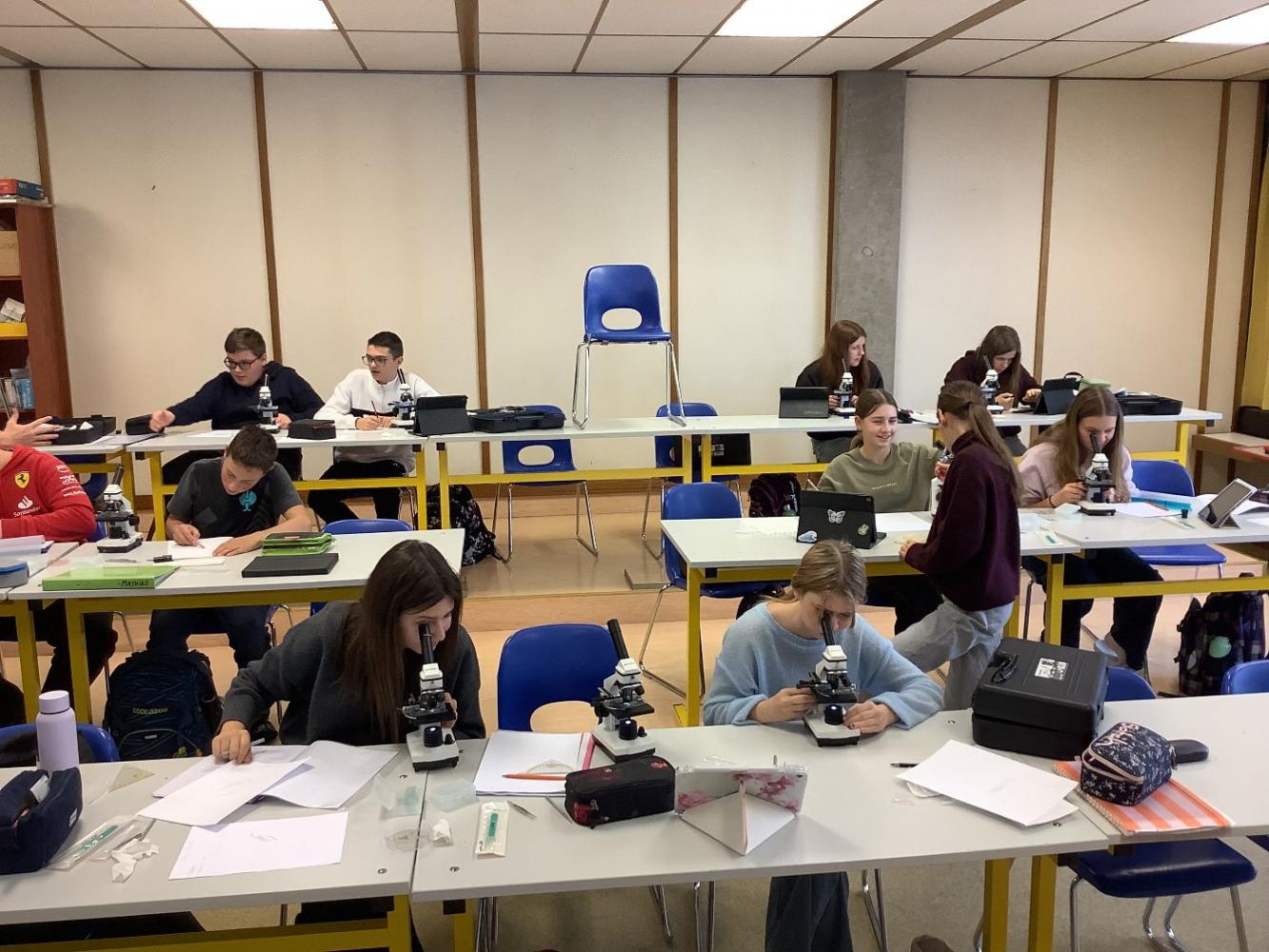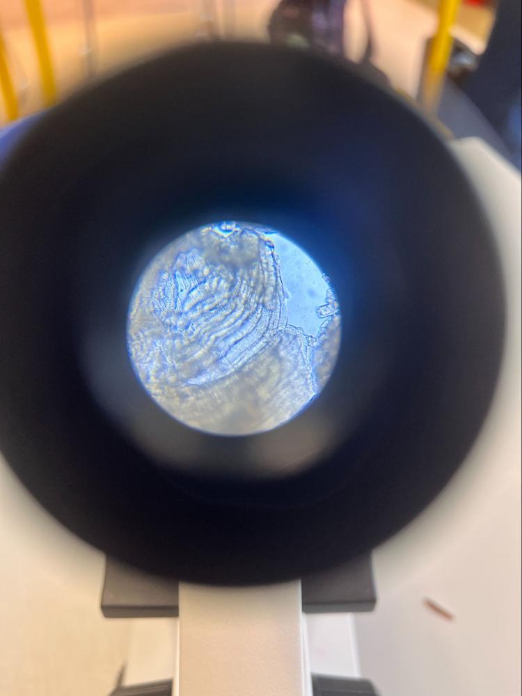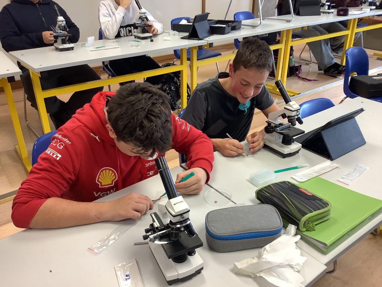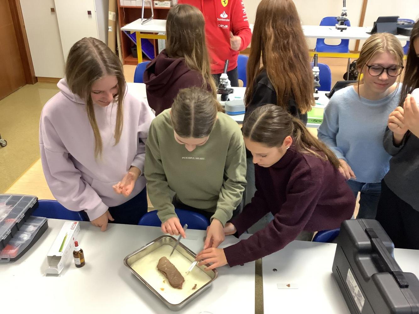 Die Schüler:innen haben diesmal in der Forscherwerkstatt die Muskelzellen unter dem Mikroskop angeschaut. Neben der Vermittlung von Theorie wurde/n anhand von Rindfleisch das/die Muskelgewebe/-zellen unter dem Mikroskop betrachtet.